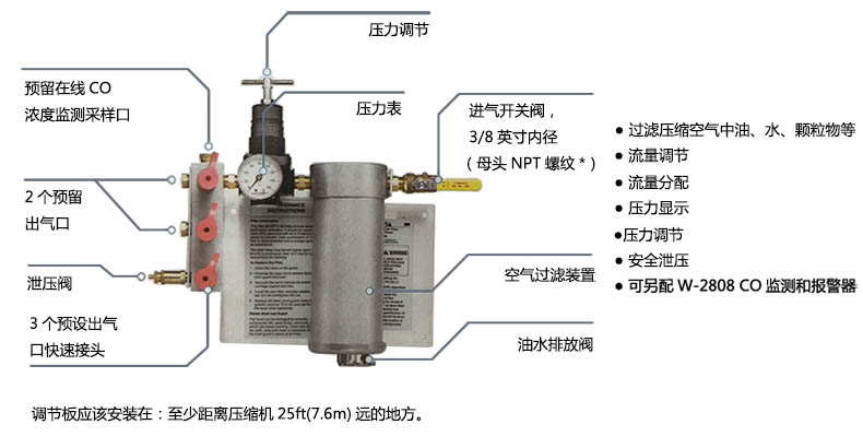 ●高效過(guò)濾水,油及空氣顆粒物,保證空氣清潔。調(diào)節(jié)空氣壓力,分配流量,并可另配W-2808一氧化碳聲光報(bào)警檢測(cè)器。可供5人同時(shí)工作使用。能高效過(guò)濾一氧化碳,水,油及空氣顆粒物;